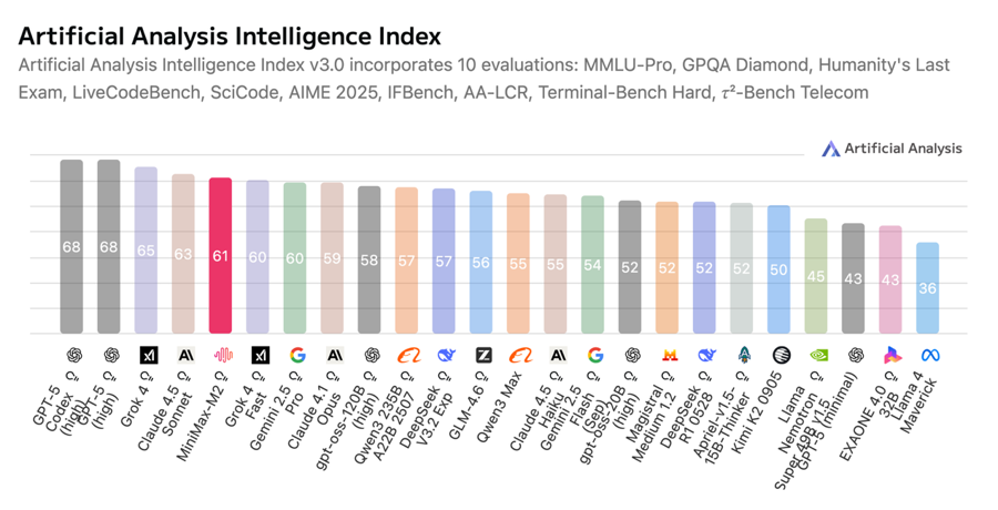 根据Artificial Analysis最新榜单,MiniMax M2在编码、指令遵循和智能体(Agent)等核心任务上全面进入全球前列——