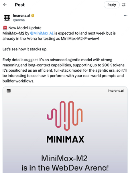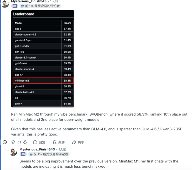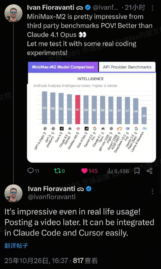 极致的智能水平、响应延迟与成本效率体验,让海外的AI开发者给予中国开源模型一致好评。知名平台LMarena第一时间发X,向开发者推荐M2模型测试; Reddit社区技术大V在基准测试中运行了MiniMax M2,“它获得了58.3%的分数,这算是相当不错的表现”;CoreViewHQ 联合创始人兼CTO伊万·菲奥拉万特表示:“MiniMax-M2的表现相当出色!甚至比Claude 4.1 Opus还要好,即使在实际使用中也令人印象深刻”;更有海外个人开发者接入API进行了广泛测试,并在技术社区分享真实案例。