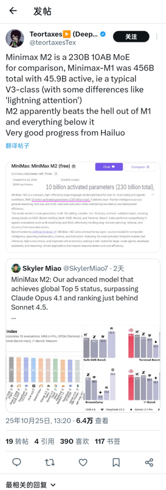MiniMax方面表示,M2专为编码与智能体任务深度优化,具备强大的端到端开发与执行能力,可实现多代码文件的自动调试与修复。这款仅有10B激活参数(总参230B)的轻量级模型,在保持卓越性能的同时,实现了更低的延迟与成本,以及更高的吞吐效率,完美契合了新兴多智能体工作流对高效协同与快速响应的需求。